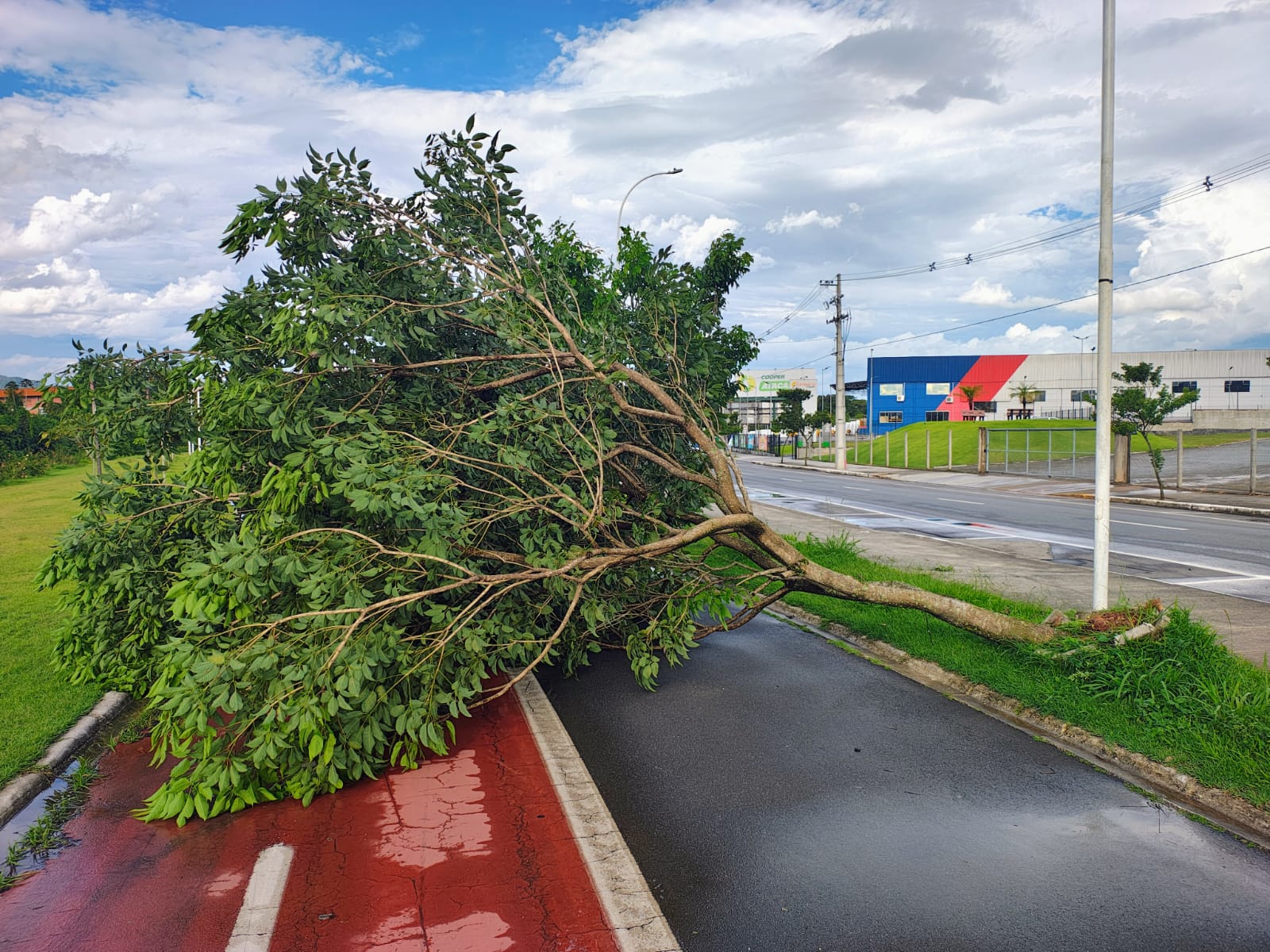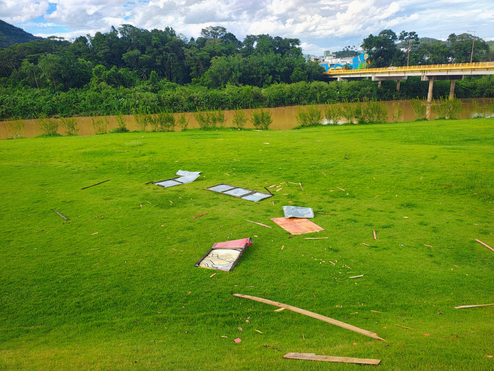 Já na Via Verde, na rua Victor Bauer, o vendaval também arrancou placas e outras estruturas, evidenciando a intensidade da chuva e dos ventos que atingiram a região.