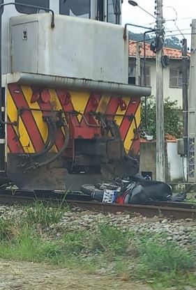 Um trem da Ferrovia Tereza Cristina (FTC) colidiu com uma motocicleta ontem em Capivari de Baixo. A condutora do veículo caiu sobre a PN e não conseguiu retirar a moto antes da passagem do trem.