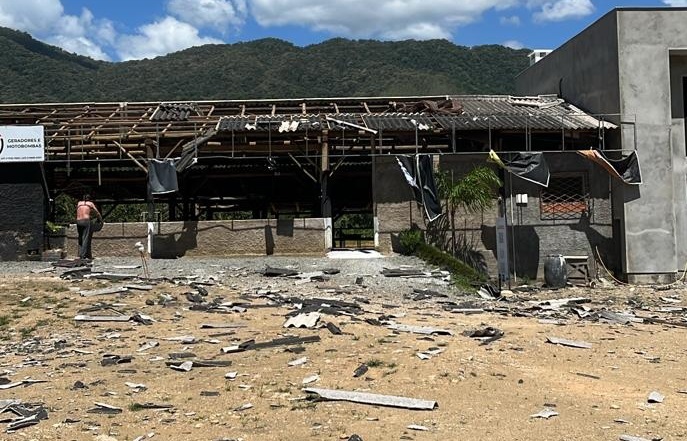 Uma rajada de vento forte arrancou praticamente todo o telhado de um galpão na tarde desta quarta-feira (10) em Schroeder. O caso ocorreu na Rua Otto Carlos Doege, no bairro Itoupava-Açú, por volta das 14h.