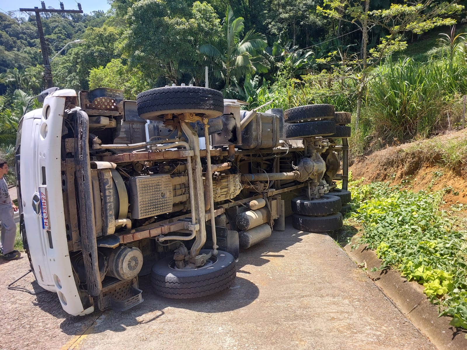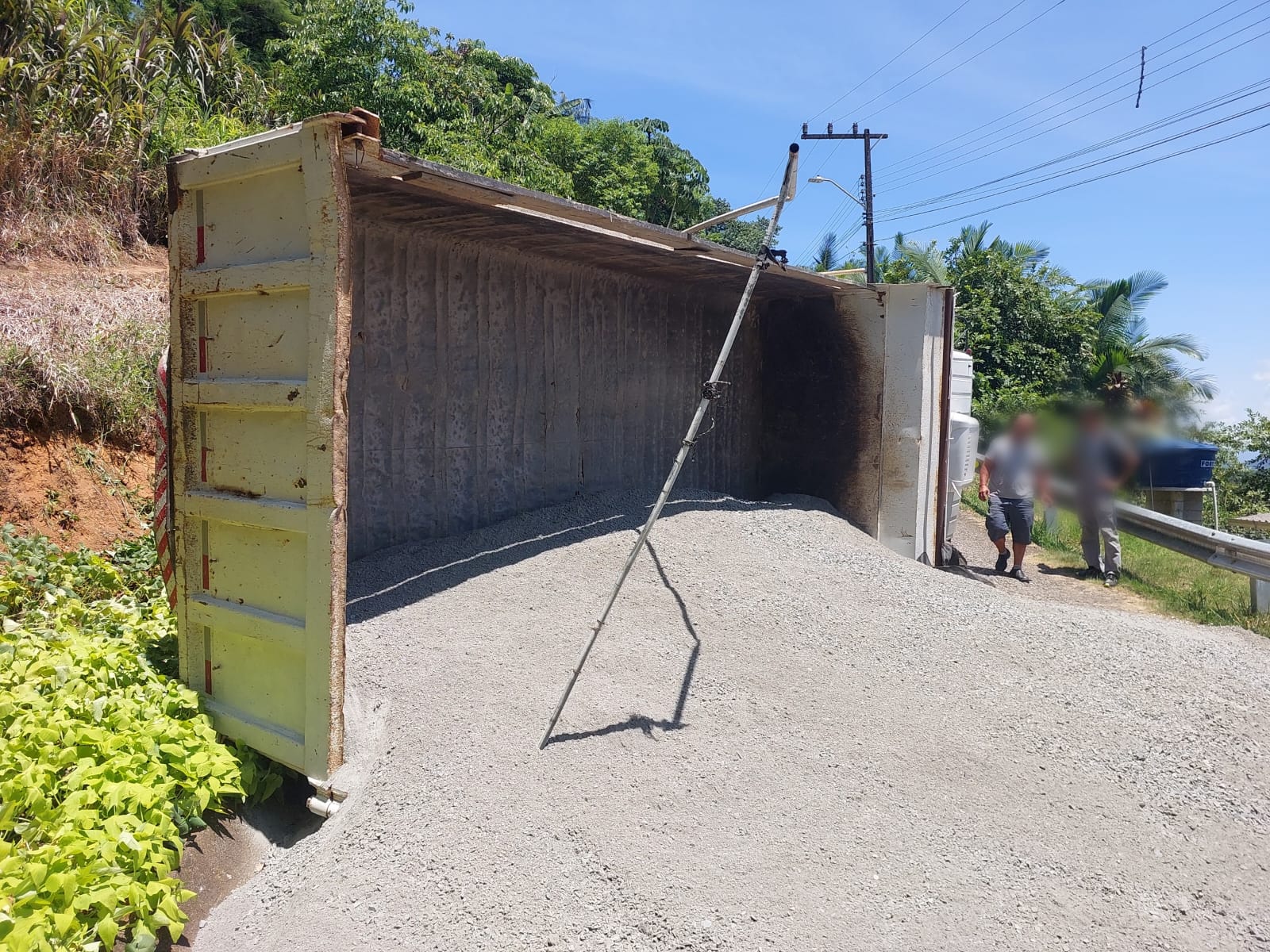 Na manhã desta segunda-feira (12), um caminhão que transportava pó de brita tombou em Jaraguá do Sul.