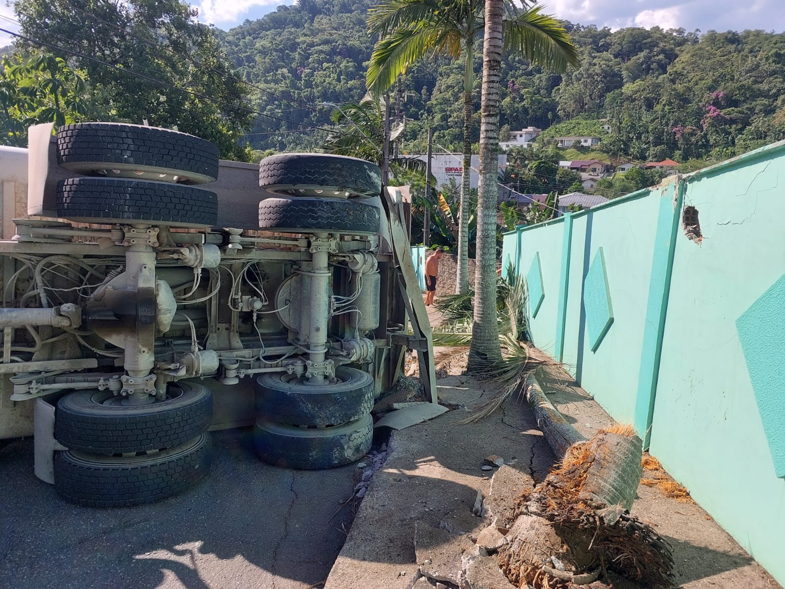 Para evitar danos maiores e uma colisão com alguma residência, o condutor jogou o caminhão contra um barranco.