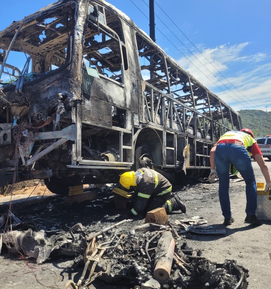 Conforme o capitão Íris, supervisor operacional do Corpo de Bombeiros Militar da SC (CBMSC), o motociclista ficou preso sob o ônibus, que entrou em chamas rapidamente. A vítima veio a óbito ainda no local.